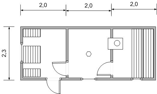С общей площадью 14 м² и габаритами 6х2,3 метра, баня «ПБ-6» имеет классическую планировку с тремя отдельными помещениями:
