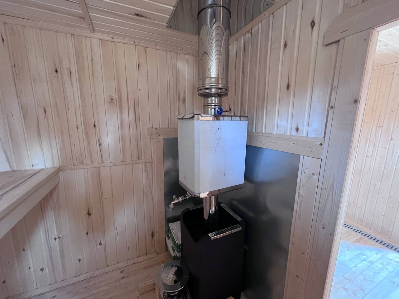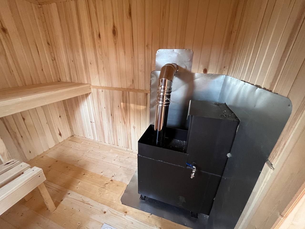 | В парном отделении | Двухъярусные осиновые полки, банная металлическая печь Каменка-3 со встроенным баком под воду 55 л, выход трубы в стену. Установка печи с использованием не горючих материалов: Базальтовая вата и оцинкованные экраны. Две коробки камней 40 кг. |