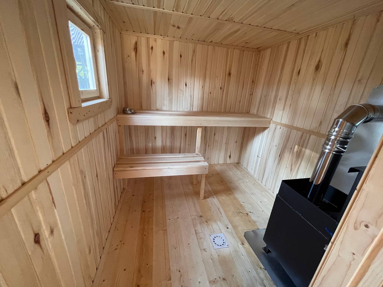 | Внутренняя отделка | Раздевалка и моечное отделение: потолок, перегородки обшиваются вагонкой хвойных пород древесины. На стыки углов стен, потолка и пола прибивается плинтус. Парное отделение: потолок, перегородки и стены обшиваются осиновой вагонкой. Под вагонкой по периметру прокладывается алюминиевая фольга. На стыки углов стен, потолка и пола прибивается плинтус. |