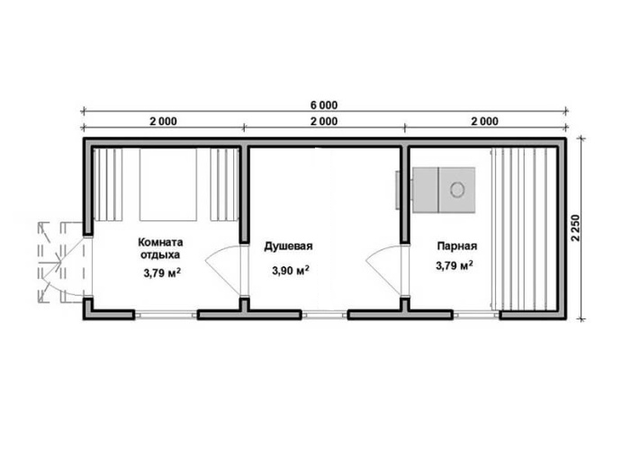 С общей площадью 14 м² и габаритами 6х2,3 метра, баня «ПБ-7» имеет классическую планировку с тремя отдельными помещениями: