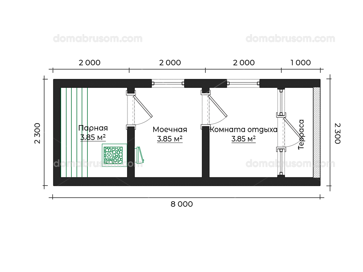Двери Входная – ПВХ однокамерный стеклопакет. В парную – стеклянная дверь с жаропрочным стеклом. В помывочную – каркасная деревянная дверь.