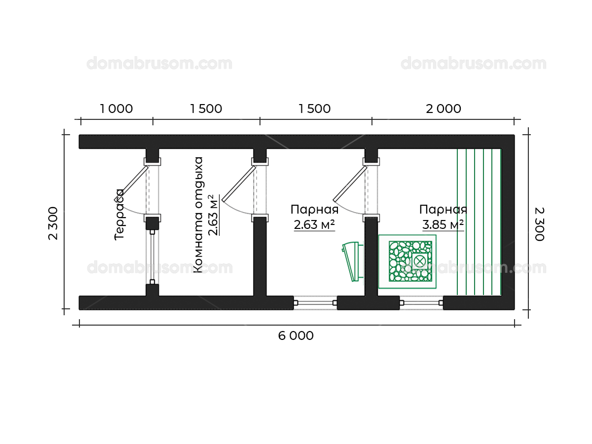 Двери Входная – ПВХ однокамерный стеклопакет. В парную – стеклянная дверь с жаропрочным стеклом. В помывочную – каркасная деревянная дверь.