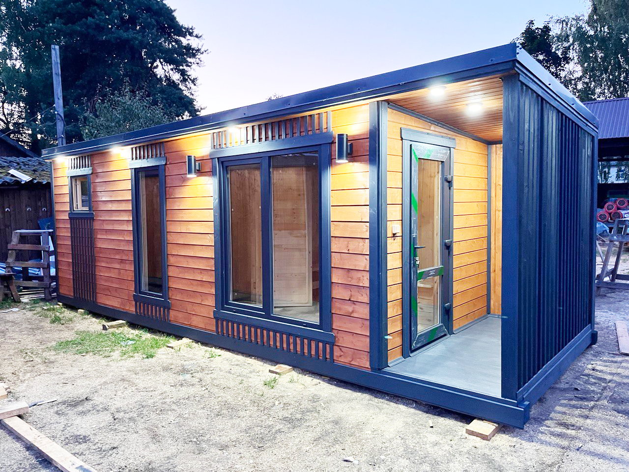 Красивая подсветка фасадов превращает баню в настоящий архитектурный акцент на вашем участке в тёмное время суток.