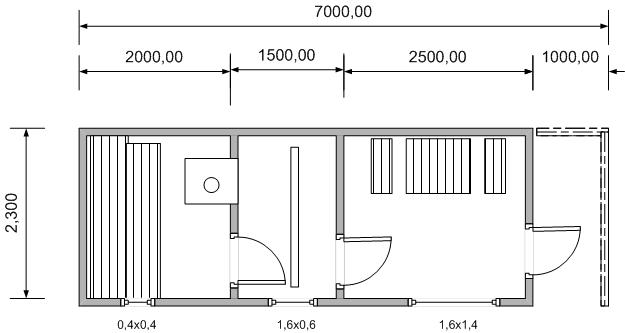 С общей площадью 16,1 м² и размерами 7х2,3 метра, баня «Лофт-4» предлагает продуманное зонирование: