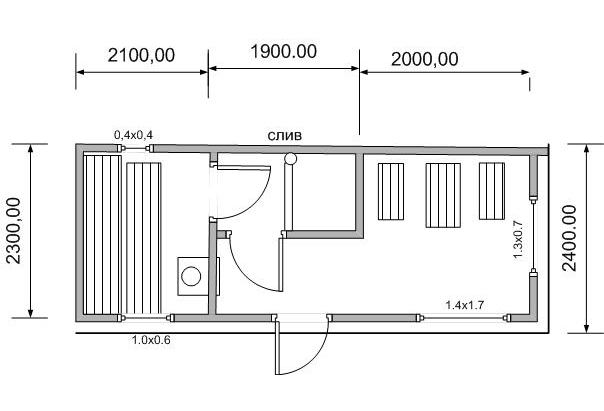 | Внутренняя отделка | Раздевалка и моечное отделение: потолок, перегородки обшиваются вагонкой хвойных пород древесины. На стыки углов стен, потолка и пола прибивается плинтус. Парное отделение: потолок, перегородки и стены обшиваются осиновой вагонкой. Под вагонкой по периметру прокладывается алюминиевая фольга. На стыки углов стен, потолка и пола прибивается плинтус. |