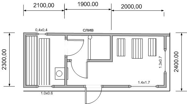 | Внутренняя отделка | Раздевалка и моечное отделение: потолок, перегородки обшиваются вагонкой хвойных пород древесины. На стыки углов стен, потолка и пола прибивается плинтус. Парное отделение: потолок, перегородки и стены обшиваются осиновой вагонкой. Под вагонкой по периметру прокладывается алюминиевая фольга. На стыки углов стен, потолка и пола прибивается плинтус. |