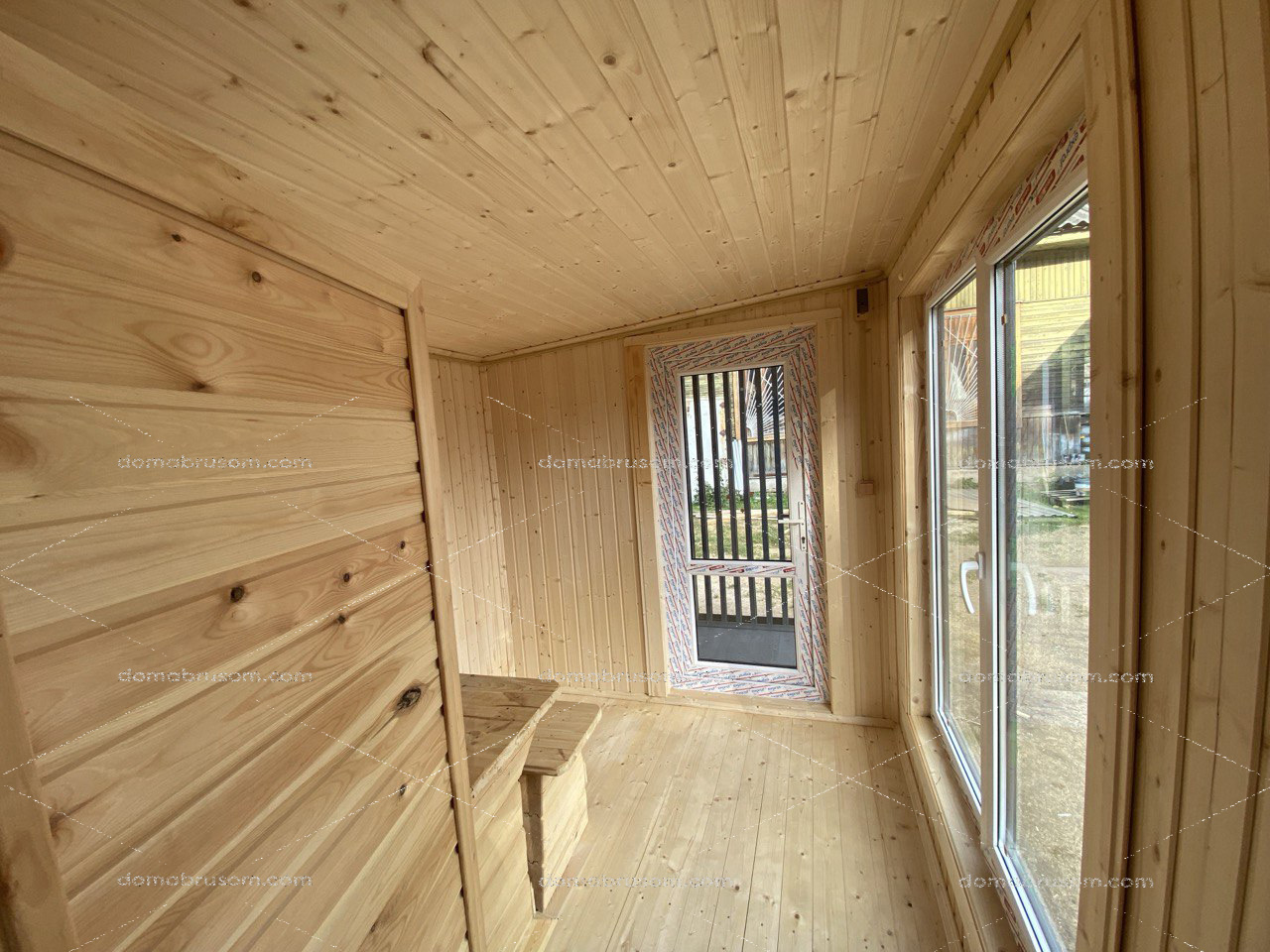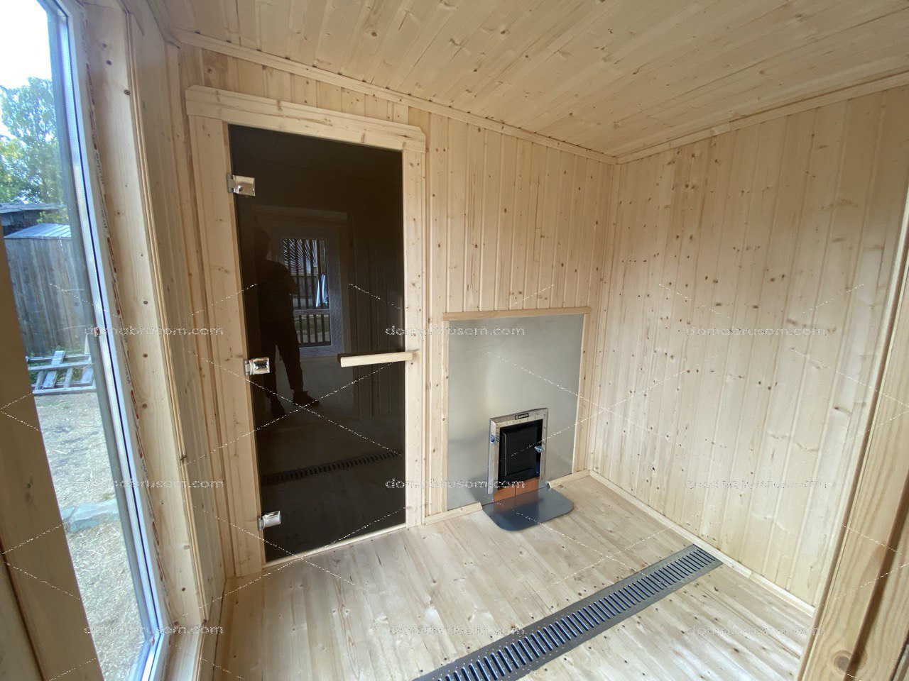 | Двери | Входная – ПВХ однокамерный стеклопакет. В парную – стеклянная дверь с жаропрочным стеклом. В помывочную – каркасная деревянная дверь. |