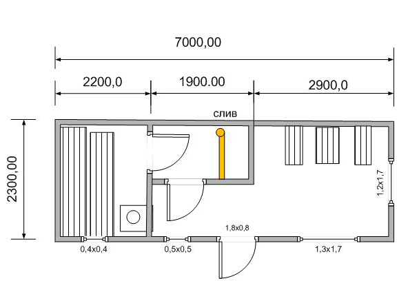 С общей площадью 16,1 м² и габаритами 7х2,3 метра, баня «Лофт-5» предлагает грамотную планировку:
