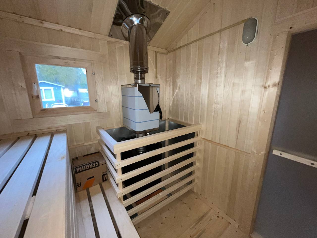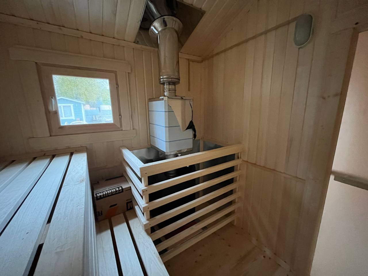 Главная особенность — выносная топка печи на улицу. Это значит, что парилка остаётся чистой, а растопка удобна и безопасна.