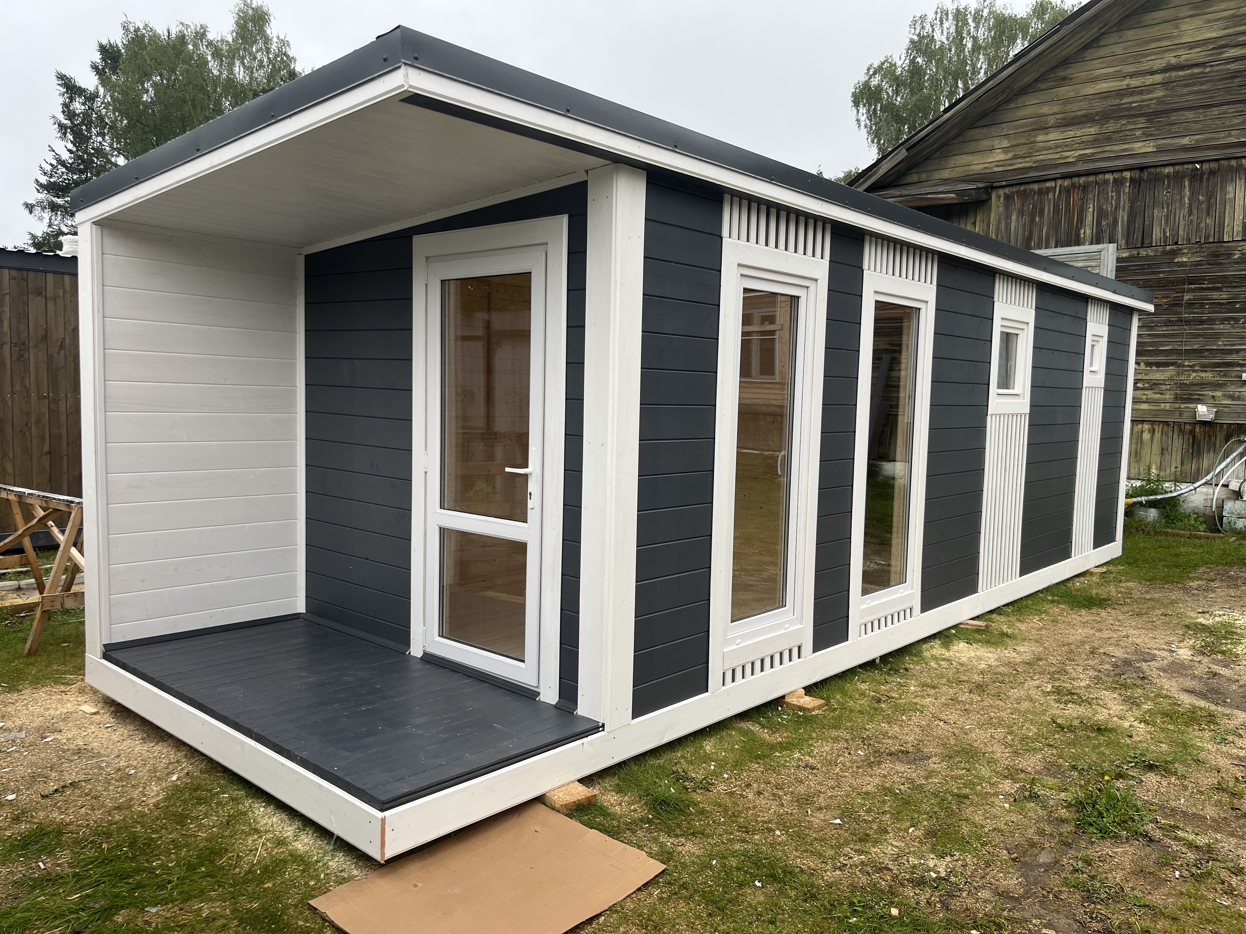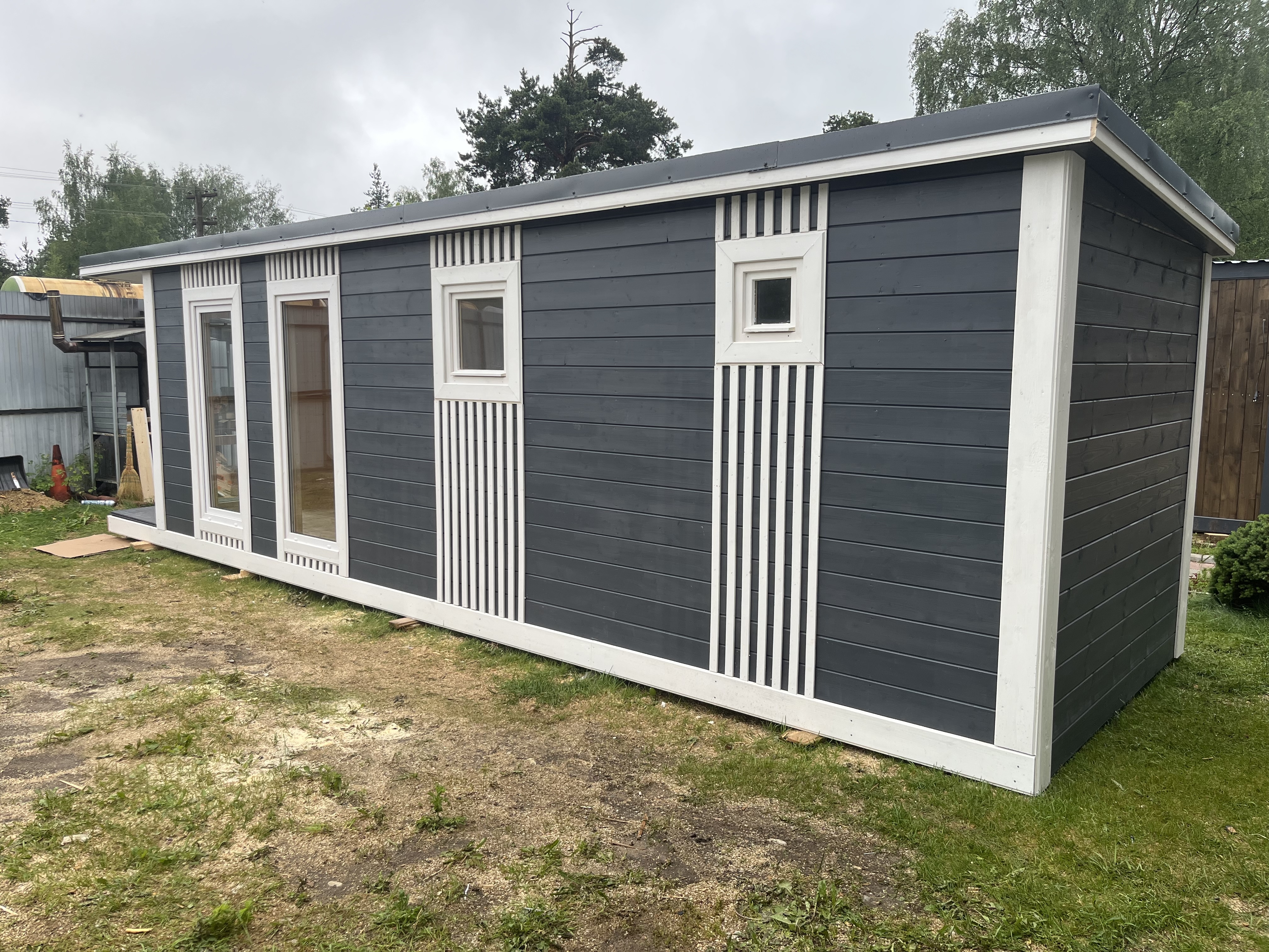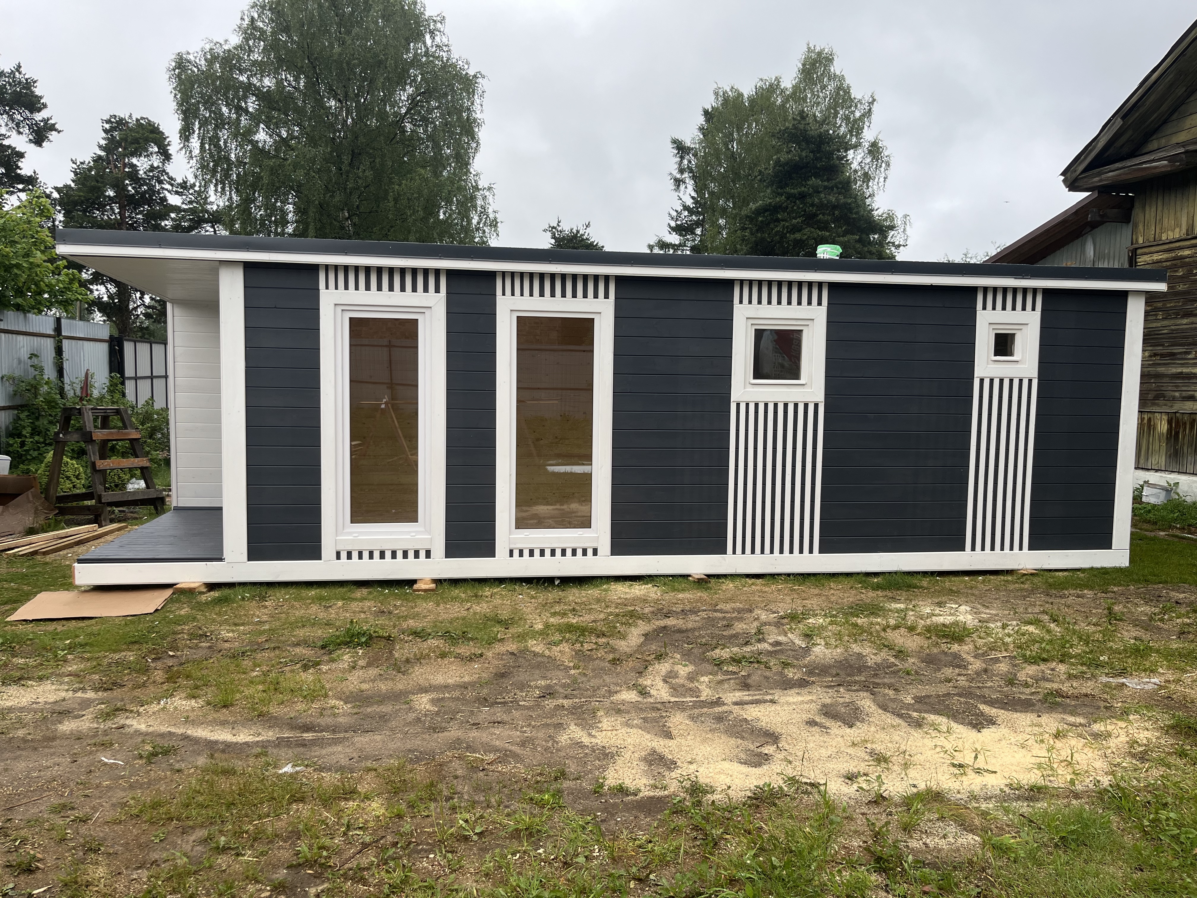 В Ломоносовском районе мы установили современную баню «Лофт» 8×2,3 м в эффектном тёмно-синем цвете с контрастной белой обводкой.
