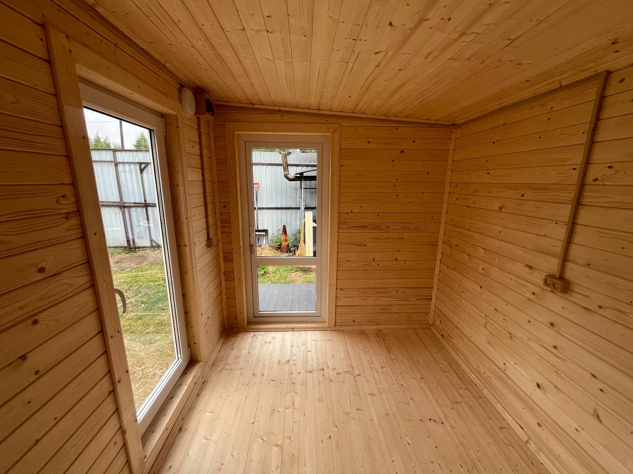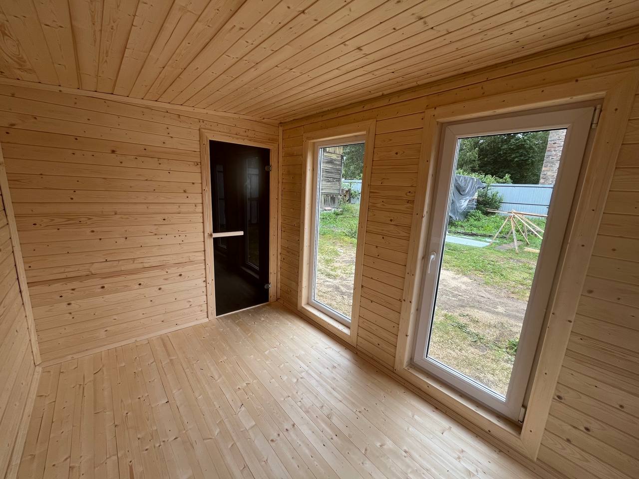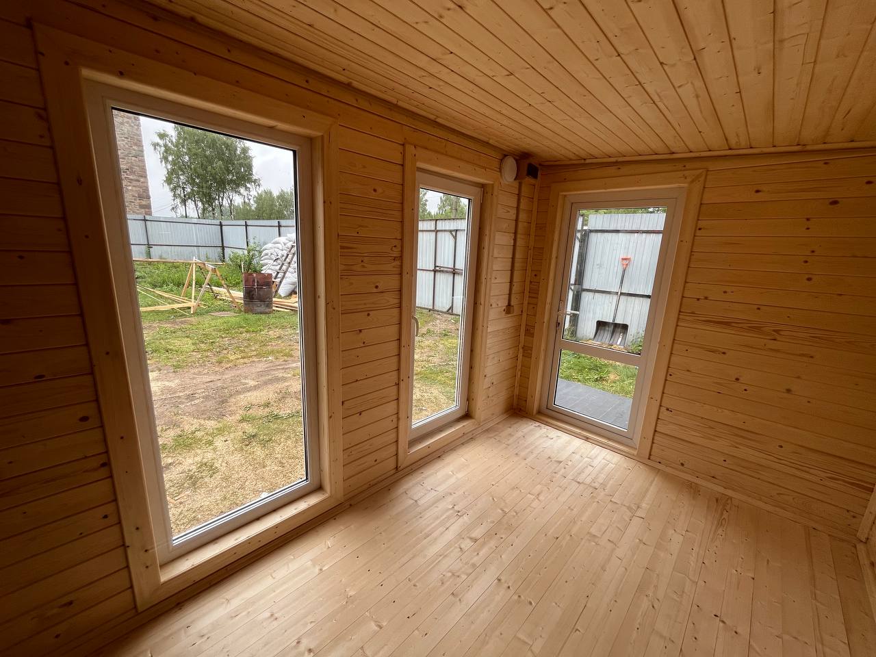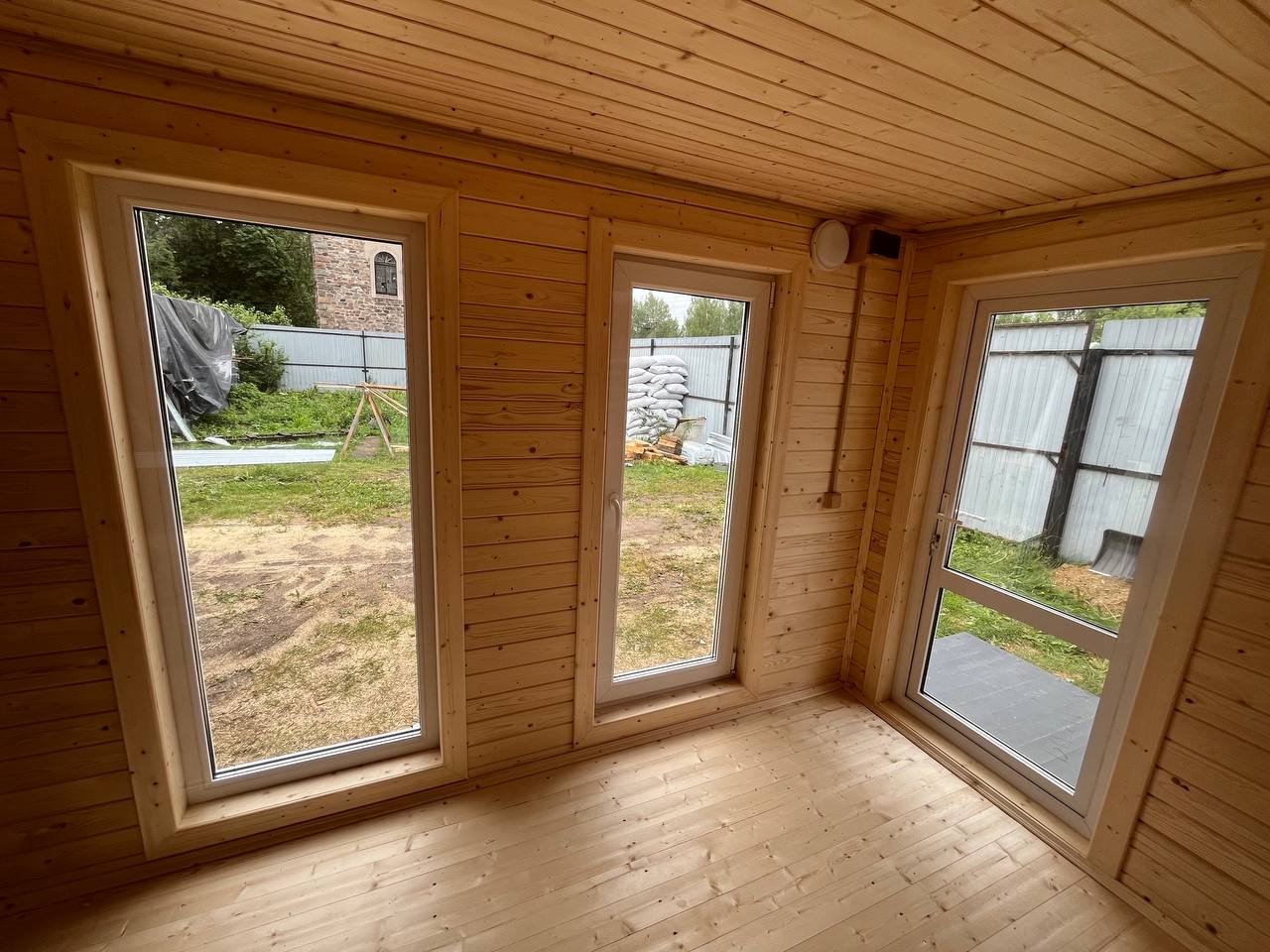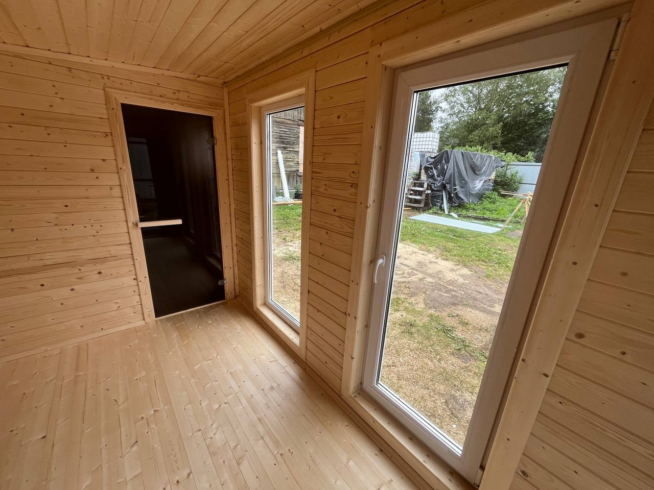 Баня выполнена по каркасной технологии с утеплением и внешней отделкой имитацией бруса, что обеспечивает прочность, долговечность и отличный внешний вид.