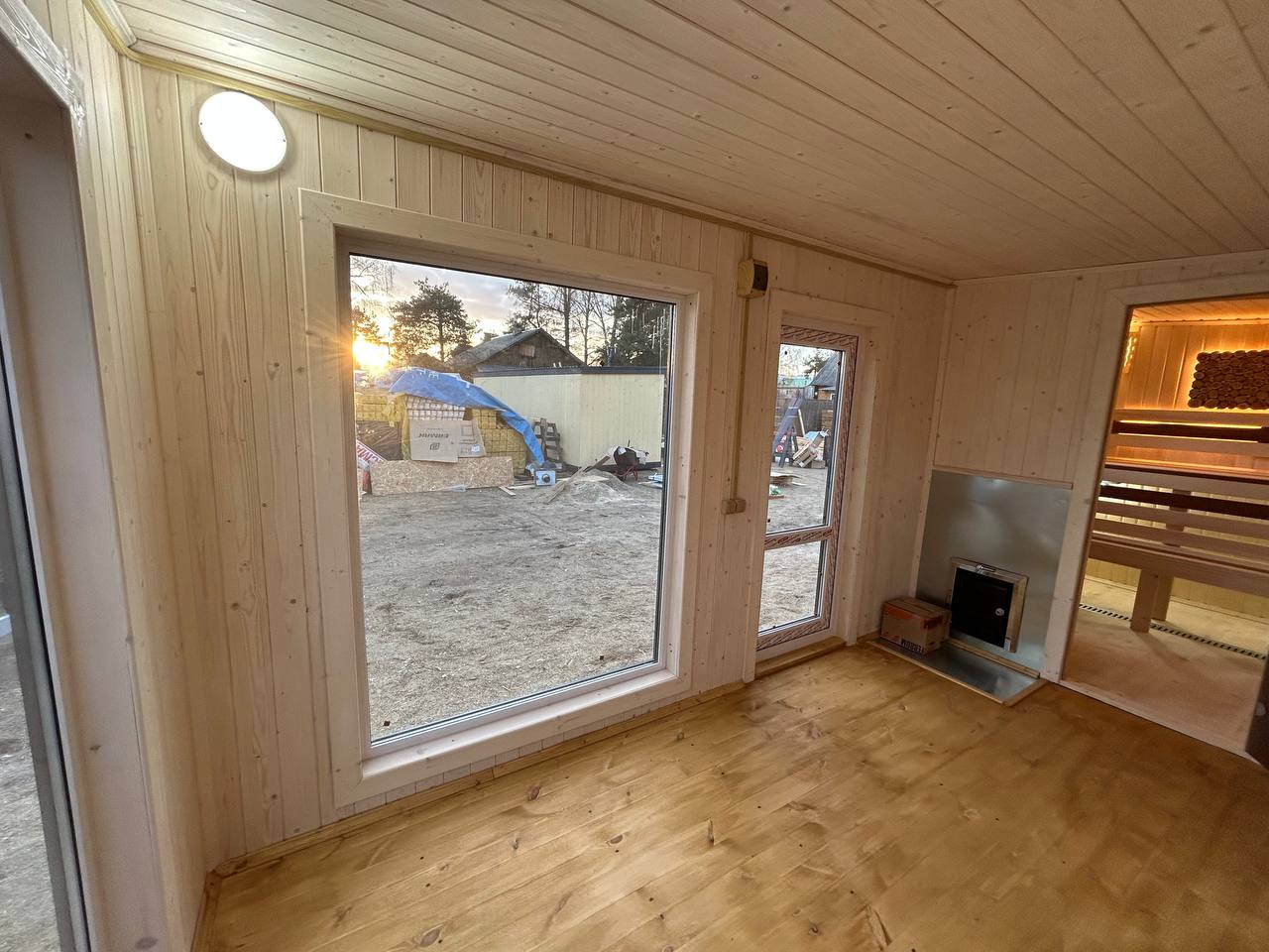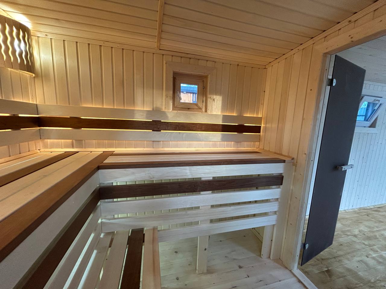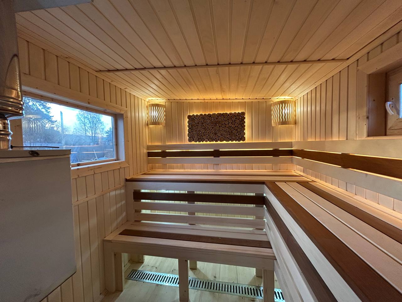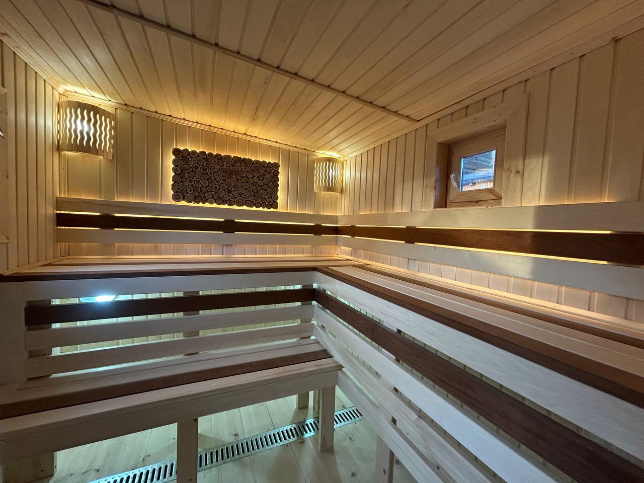 Уличная подсветка фасадов — создаёт атмосферу уюта вечером и подчёркивает архитектуру бани