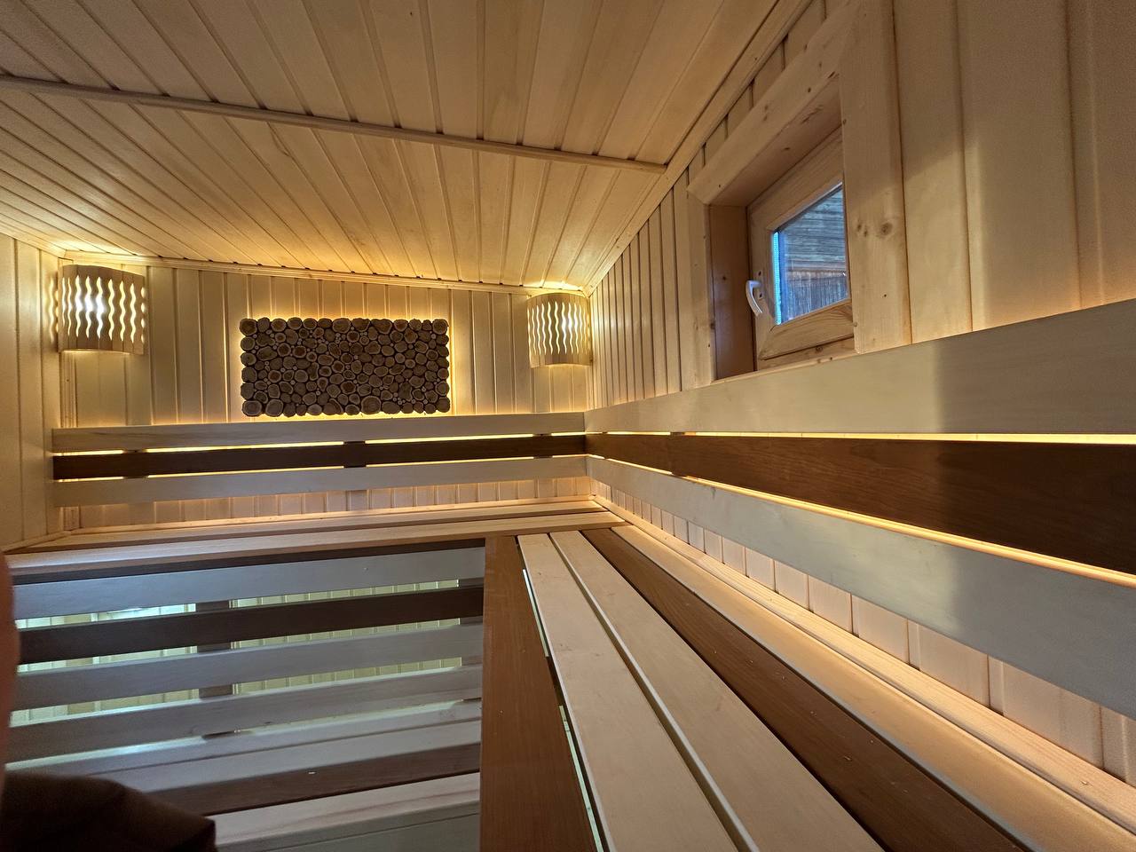 Парная с панно из спилов можжевельника — не только красиво, но и с приятным ароматом древесины